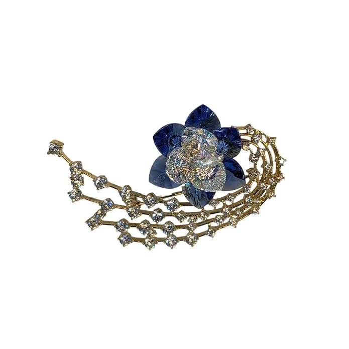 เข็มกลัดดอกไม้คริสตัลหรูหรามีกลีบสีฟ้าและพลอยเทียมสีทองที่สง่างามเข็มกลัดสำหรับงานเลี้ยงของผู้หญิง