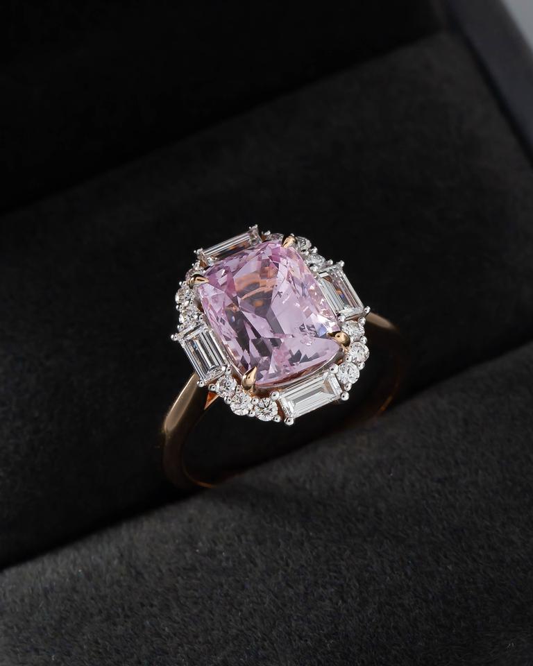 แหวนหมั้นสไตล์วินเทจประดับไพลินสีชมพูทรงคุชชั่นคัท ล้อมเพชรทรงบาแกตต์และทรงกลม ตัวเรือนทองคำขาว 14K สำหรับเธอ
