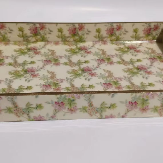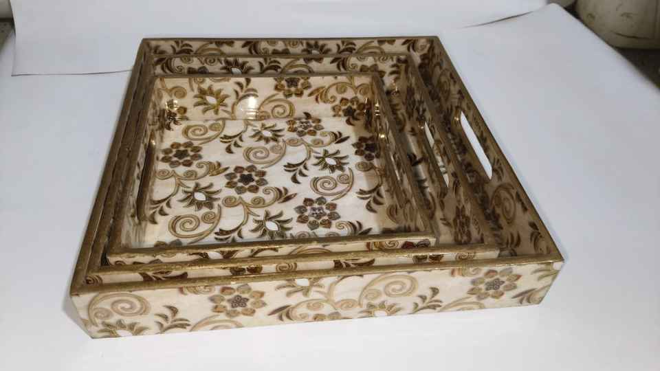 Premium Designer Artisan Wooden Enamel Printed Tray Set with High Gloss Gold Foil Surface for Sophisticated Table Styling
