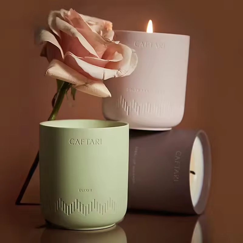 เทียนหอมอโรมาเธอราพีจากขี้ผึ้งถั่วเหลือง กลิ่นหอมจากน้ำมันพืชธรรมชาติ พร้อมแกนไม้แท้ บรรจุในโถเซรามิกพิมพ์โลโก้แบบสั่งทำพิเศษ พร้อมกล่องของขวัญ