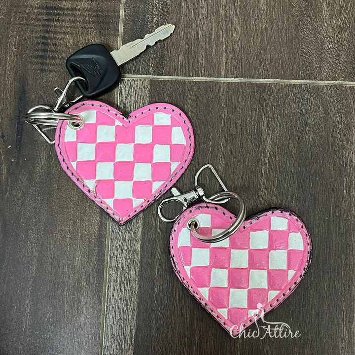 พวงกุญแจรูปหัวใจลายตารางหมากรุกสีชมพูและสีขาวสุดหรูพวงกุญแจหนังวัวแบบใช้มืออุปกรณ์เสริมกุญแจย้อนยุค