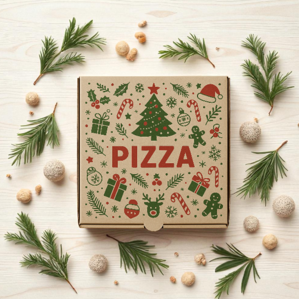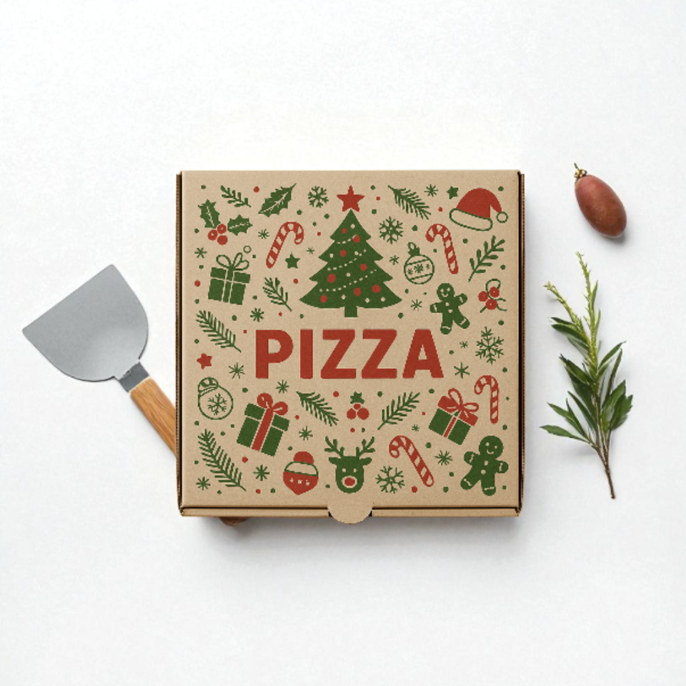 กล่องพิซซ่าแบบสั่งทำสุดหรูบรรจุภัณฑ์ที่เป็นมิตรต่อสิ่งแวดล้อมพร้อมดีไซน์เทศกาลคริสต์มาสในวันหยุดสำหรับร้านอาหารและอีเวนต์