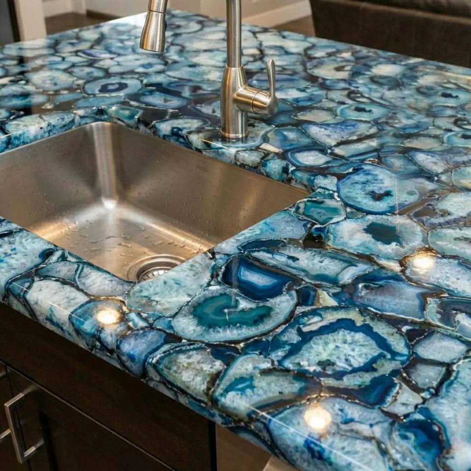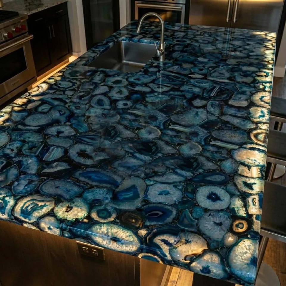 โต๊ะหินอัญมณีกึ่งมีค่าสั่งทำพิเศษสุดหรูหรา โต๊ะคริสตัลแผ่นใหญ่สำหรับรับประทานอาหาร โต๊ะกาแฟ โต๊ะบาร์ ดีไซน์พร้อมไฟ LED ด้านหลัง