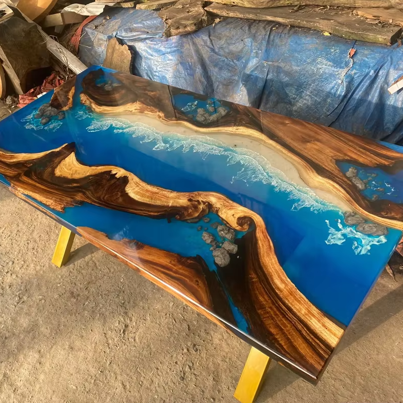 โต๊ะอาหารไม้แผ่นเดียวสั่งทำพิเศษ ดีไซน์ทันสมัยลายทะเล ท็อปเรซิ่นอีพ็อกซี่ สำหรับห้องโถงและห้องนั่งเล่น