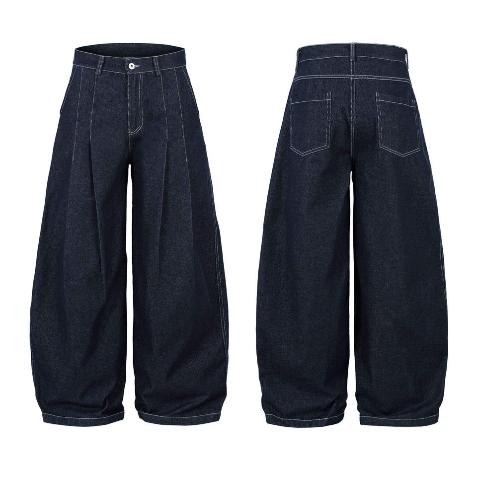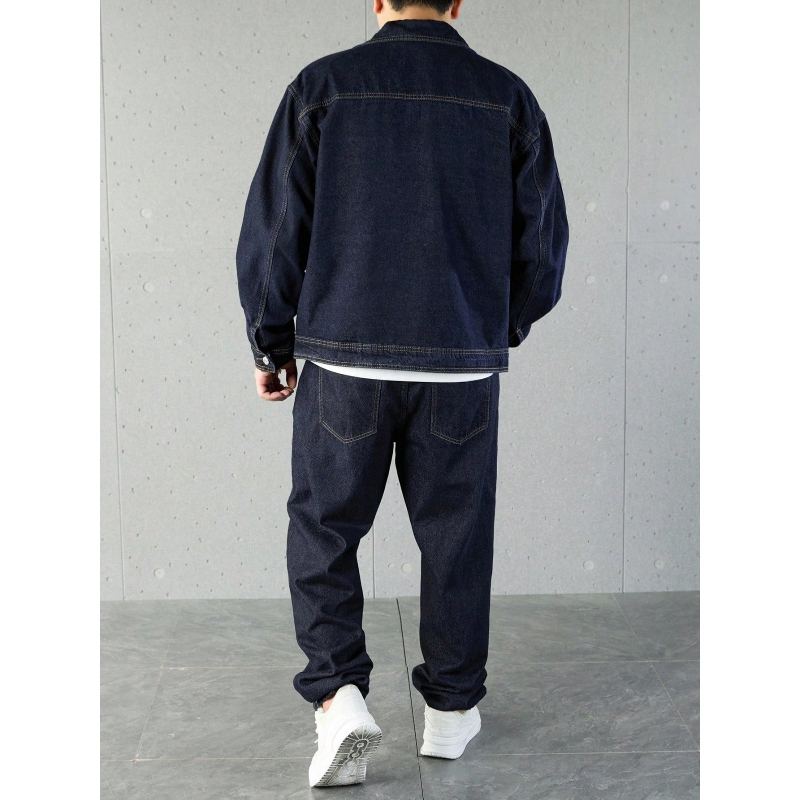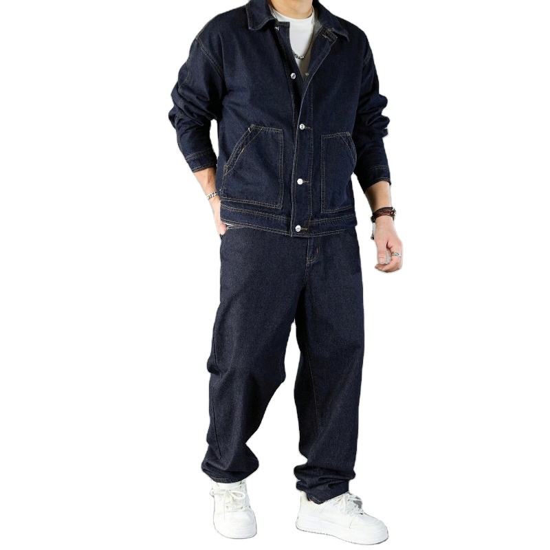 ชุดลำลองฤดูหนาวสำหรับผู้ชายสุดหรูแบบสั่งตัดพิเศษ แจ็คเก็ตยีนส์ดิบสีน้ำเงินฟอก และกางเกงยีนส์ทรงหลวม สไตล์สตรีทแวร์