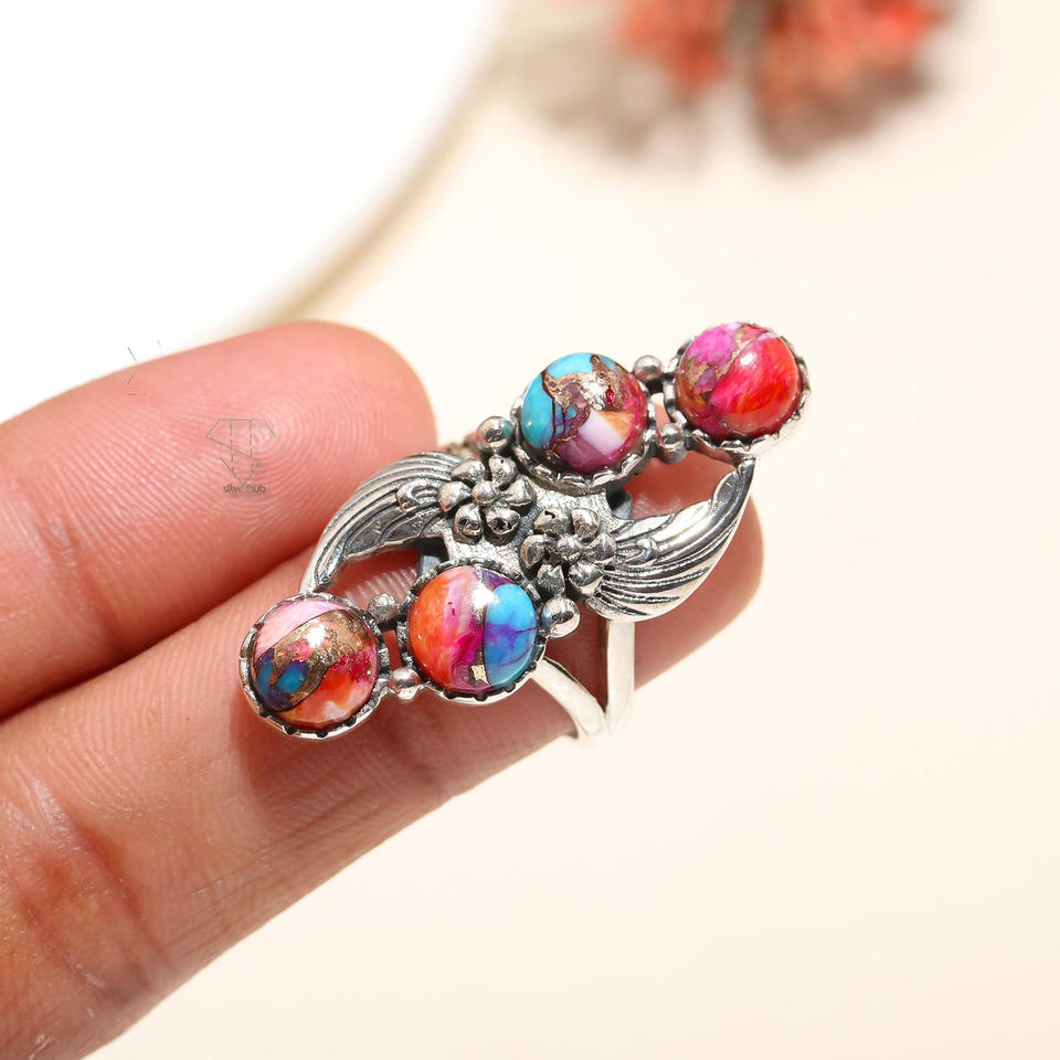 แหวนงานฝีมือรูปวงรีสีฟ้าครามธรรมชาติสีชมพูหอยนางรมสีเทอร์ควอยซ์925แหวนแบบง่ามแข็ง