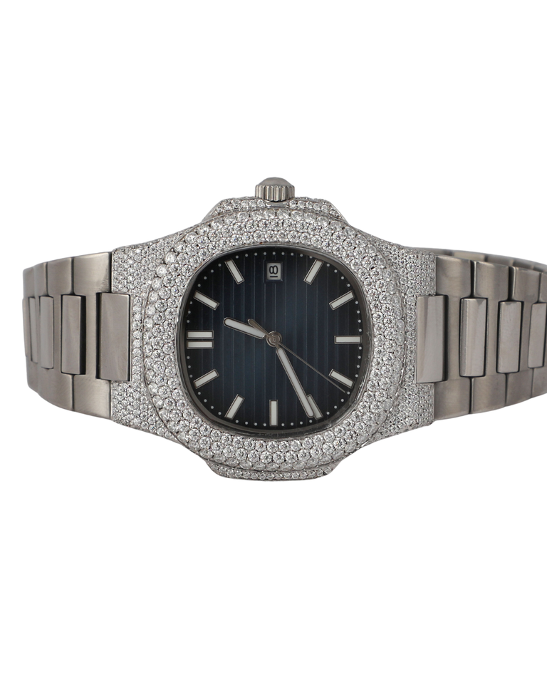 นาฬิกาข้อมือหรูหราสั่งทำพิเศษ ตัวเรือนทองคำขาวเต็มเรือน หน้าปัดสีดำประดับเพชรโมอิสซาไนต์ สายสแตนเลสประดับเพชร