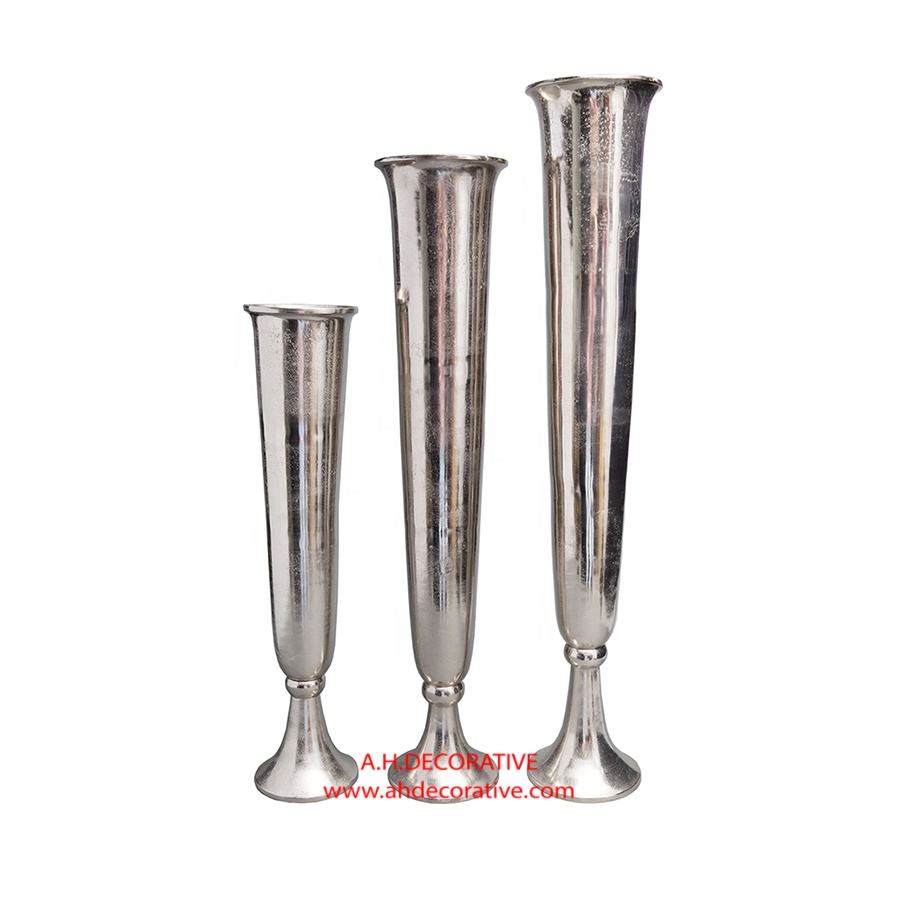 การออกแบบที่หรูหราอลูมิเนียมโลหะแจกันดอกไม้ผู้ผลิตขายส่งตกแต่งแจกันชั้นสูงสีเงินสําหรับขาย