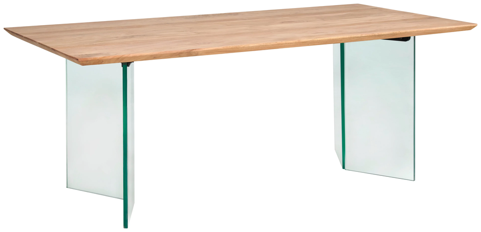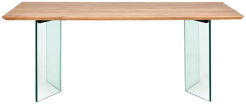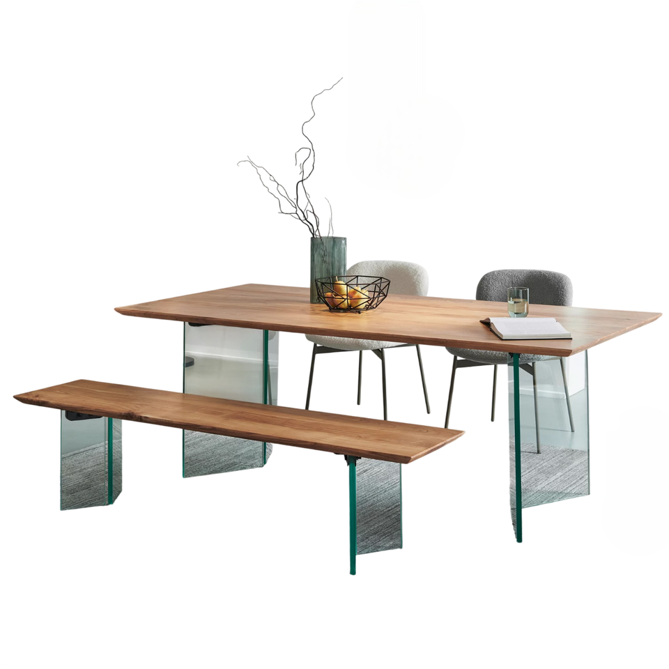 โต๊ะอาหารทรงสี่เหลี่ยมหน้าท็อปกระจกนิรภัยดีไซน์หรู ขาทรงตัวเอ ทำจากไม้กระถินณรงค์เนื้อแข็ง ผิวสัมผัสธรรมชาติ เหมาะสำหรับบ้าน ห้องครัว ร้านอาหาร