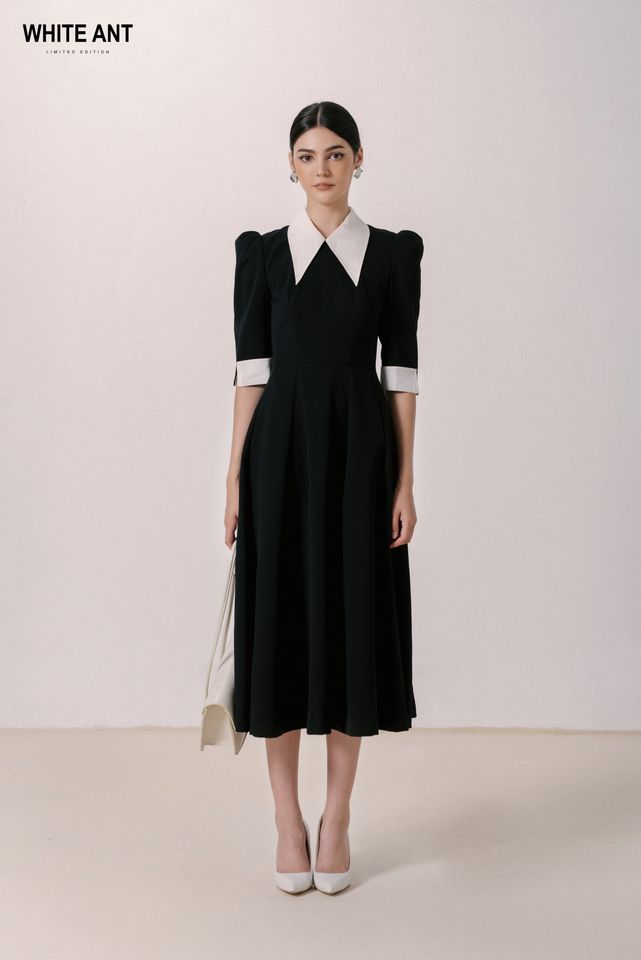 ชุดเดรสผู้หญิงดีไซน์หรูหราคอปกพับลงแบบเป็นทางการชุดเดรสคารามัทผ้าคุณภาพดีแบบกำหนดเองสีขาวบรรจุในเวียดนาม