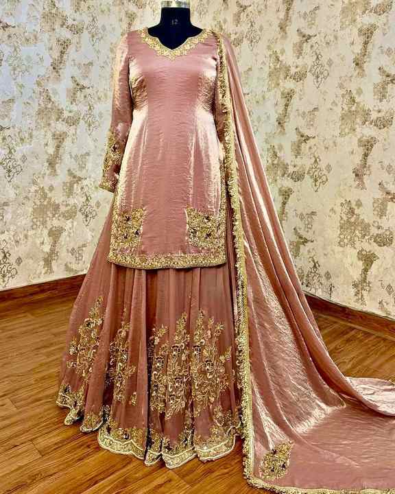 Luxury Designer Chinon Silk Sharara Suit Dupatta Set with Embroidery Real Mirror Hand Work for Women party Wear or Wedding Use