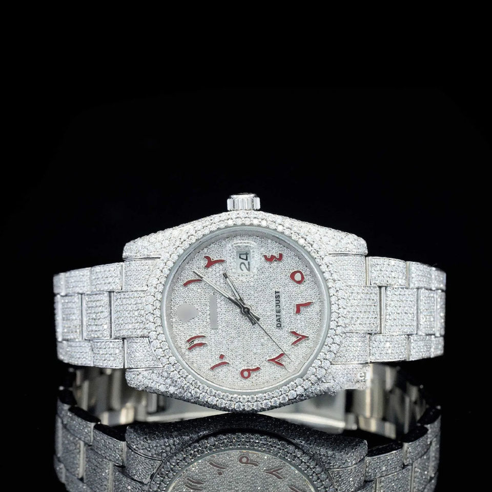 นาฬิกาผู้ชายหรูหราประดับเพชร ตัวเรือนสแตนเลส ฝังเพชร VVS1 มอยส์ซาไนต์ หน้าปัดแบบอารบิก แสดงวันที่ ของขวัญสำหรับผู้ชาย