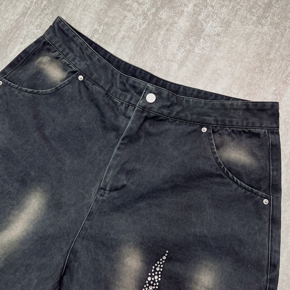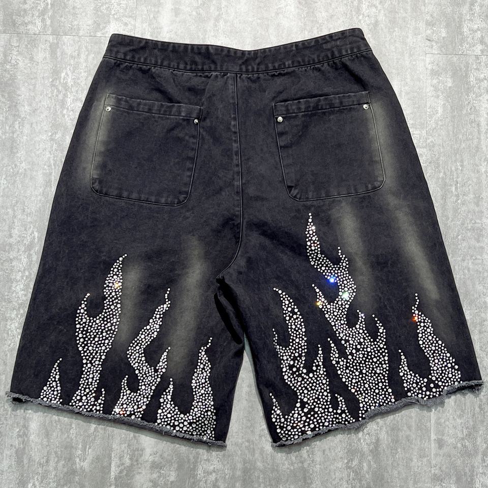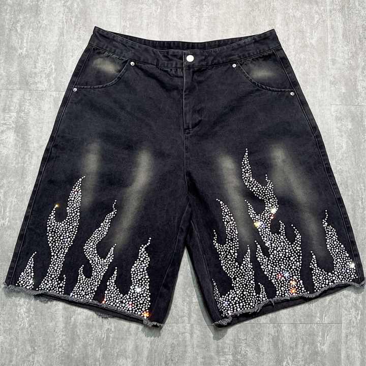 กางเกงขาสั้นทรงแบ็กกี้ดีไซน์เนอร์สุดหรู แต่งขอบดิบ สไตล์สตรีทแวร์ฤดูร้อน ล้างสีแบบแอซิด ผ้าฝ้าย ประดับคริสตัล สำหรับผู้ชาย