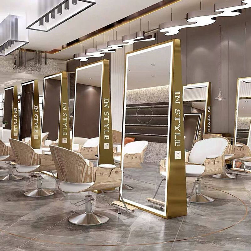 กระจกทำจากทองเหลืองกรอบสีทองมีไฟ LED ติดร้านตัดผมสองด้านสุดหรูสำหรับร้านทำผม