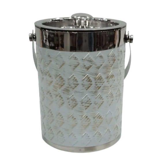 ถังน้ำแข็งสแตนเลสสองชั้นอย่างดี พร้อมฝาปิดและหูหิ้ว ตกแต่งลายนูนสีขาว สำหรับแช่แชมเปญและไวน์ เหมาะสำหรับบาร์และงานปาร์ตี้