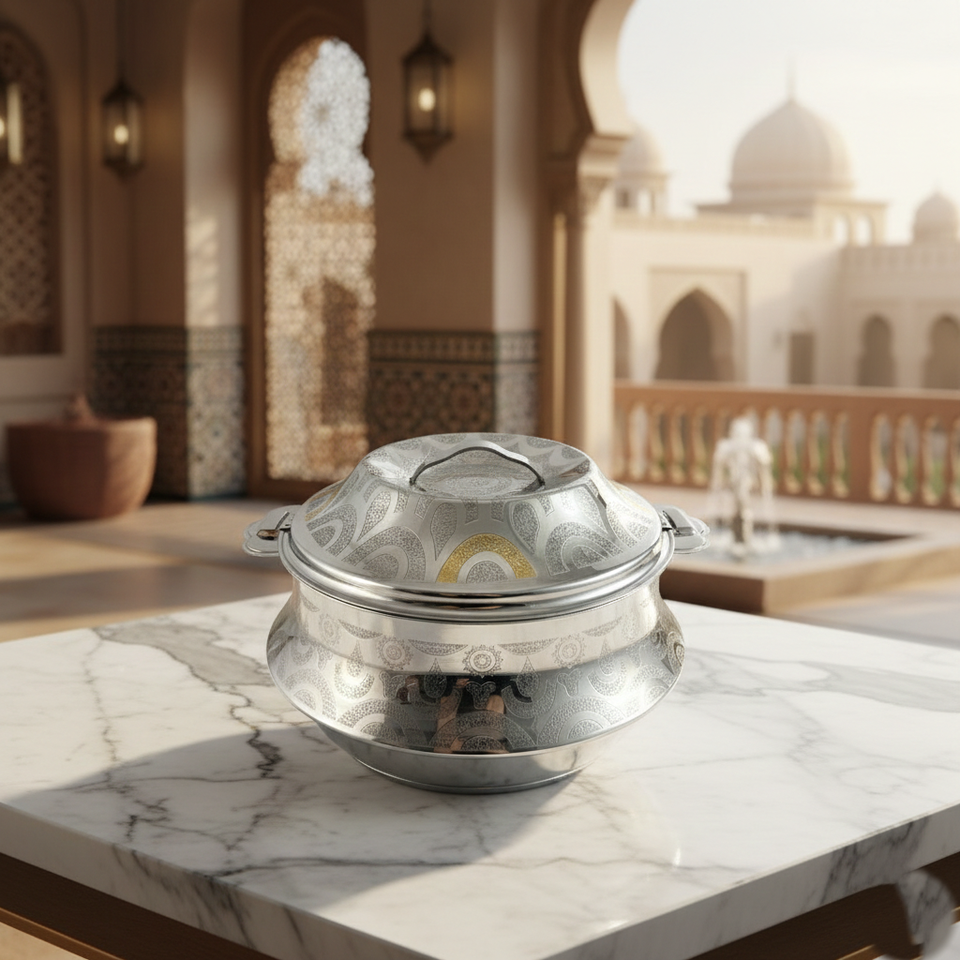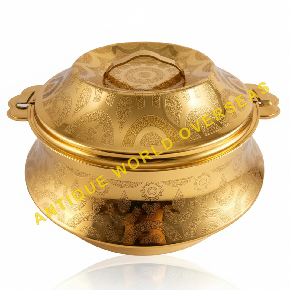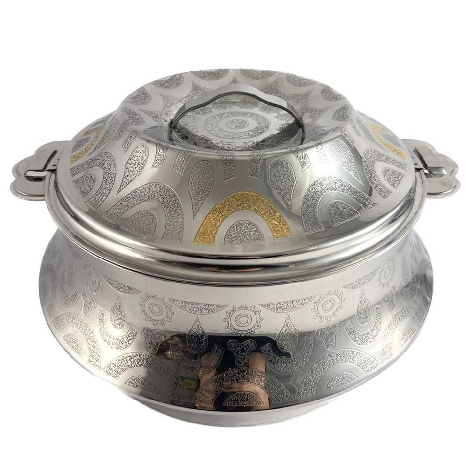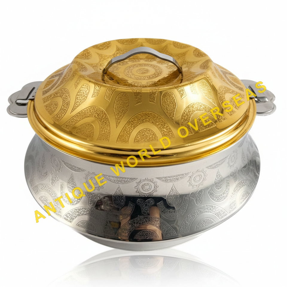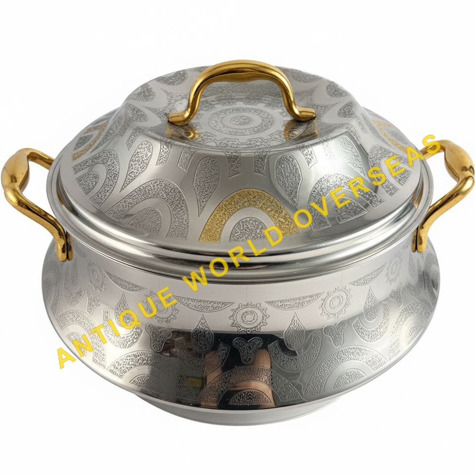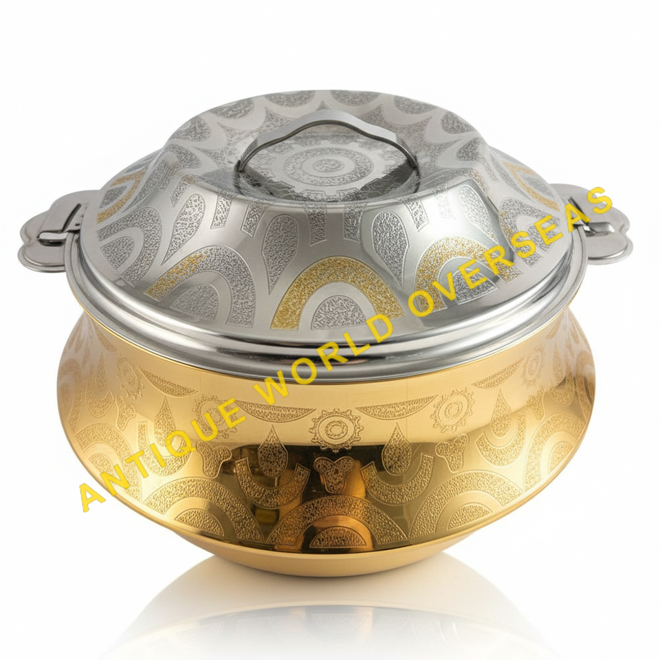 หม้ออุ่นอาหารสองสี ทอง-เงิน ลายสลัก ฉนวนกันความร้อน ไม่ติดกระทะ ภายในสแตนเลส คุณภาพพรีเมียม สำหรับโต๊ะอาหาร