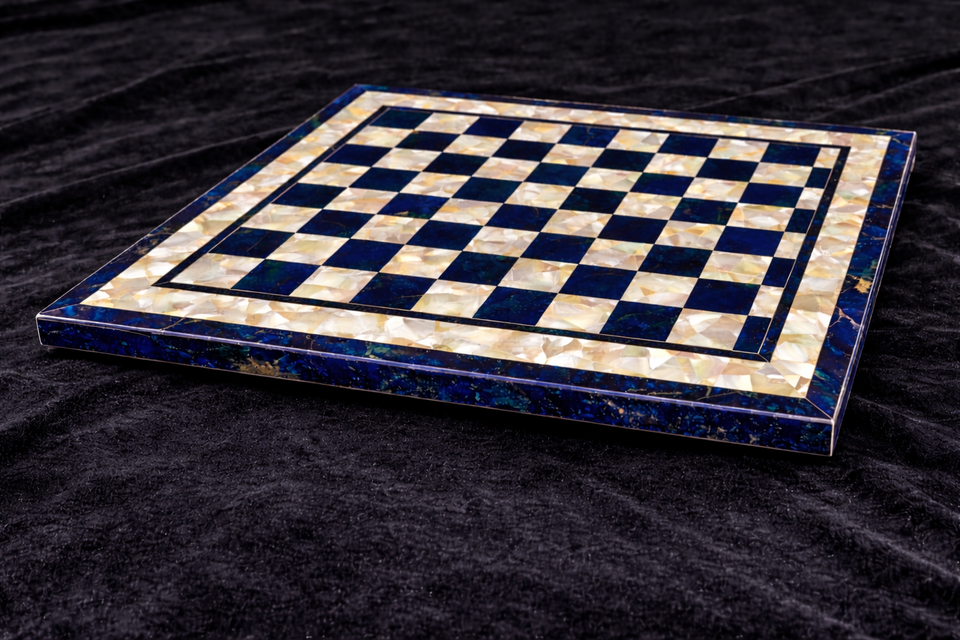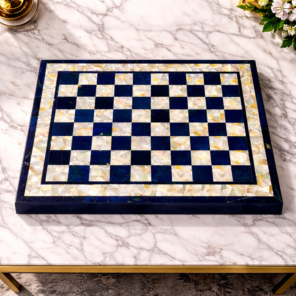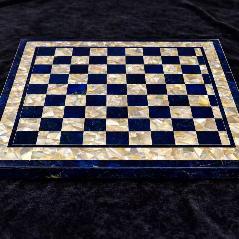 Luxury Eco-Friendly Blue Lapis Lazuli Mother Pearl Chess Board Handmade Agra Heritage Marble Inlay Chess Set for Home Decor