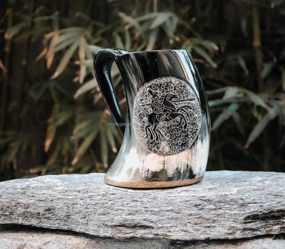 งานฝีมือหรูหราเป็นมิตรกับสิ่งแวดล้อม ทำจากเขาควายไวกิ้ง สไตล์ศาสนาและสมัยใหม่ แกะสลักสำหรับงานเฉลิมฉลองและนักสะสม