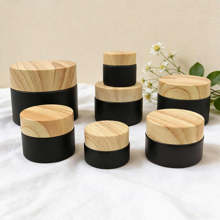 บรรจุภัณฑ์ขวดแก้วเครื่องสำอางสีดำฝาไม้แบบกำหนดเอง ขนาด 30 กรัม 50 กรัม 80 กรัม เป็นมิตรกับสิ่งแวดล้อม รีไซเคิลได้ สำหรับครีมและผลิตภัณฑ์บำรุงผิวหน้า