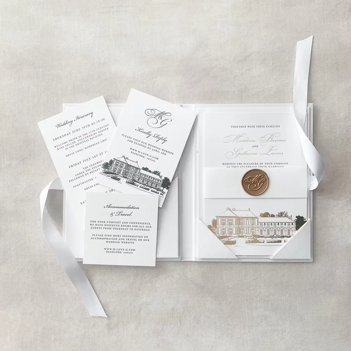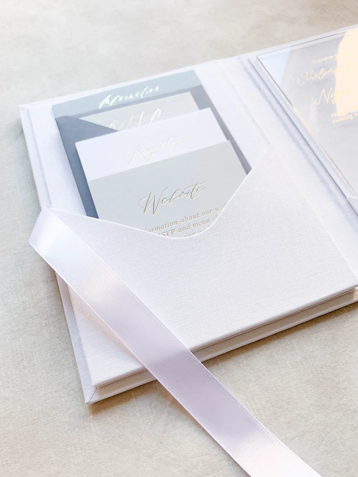 การ์ดเชิญงานแต่งงานแบบปกแข็งผ้าลินินสีขาวสุดหรูหรา พร้อมริบบิ้นผ้าไหม ดีไซน์พิเศษ ขนาด 5 x 7 นิ้ว