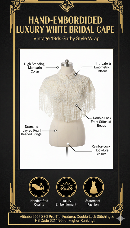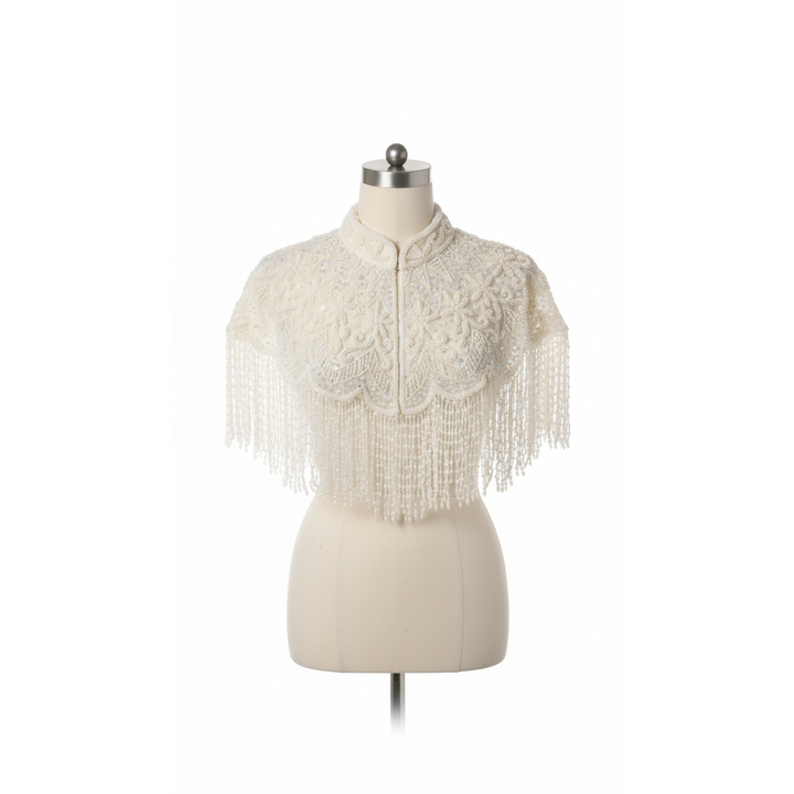 Luxury Ellora Ivory Pearl Beaded Fringe Nylon Shoulder Cape Women Wedding Bridal Evening Party Dress Embroidered Shawl Wrap