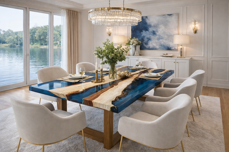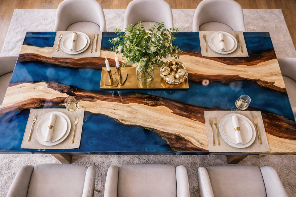 โต๊ะรับประทานอาหารเรซิ่นอีพ็อกซี่สุดหรู ลายแม่น้ำสีฟ้า โต๊ะไม้โอเชียนบลู งานแฮนด์เมด ขอบไม้ธรรมชาติ เฟอร์นิเจอร์ห้องรับประทานอาหาร