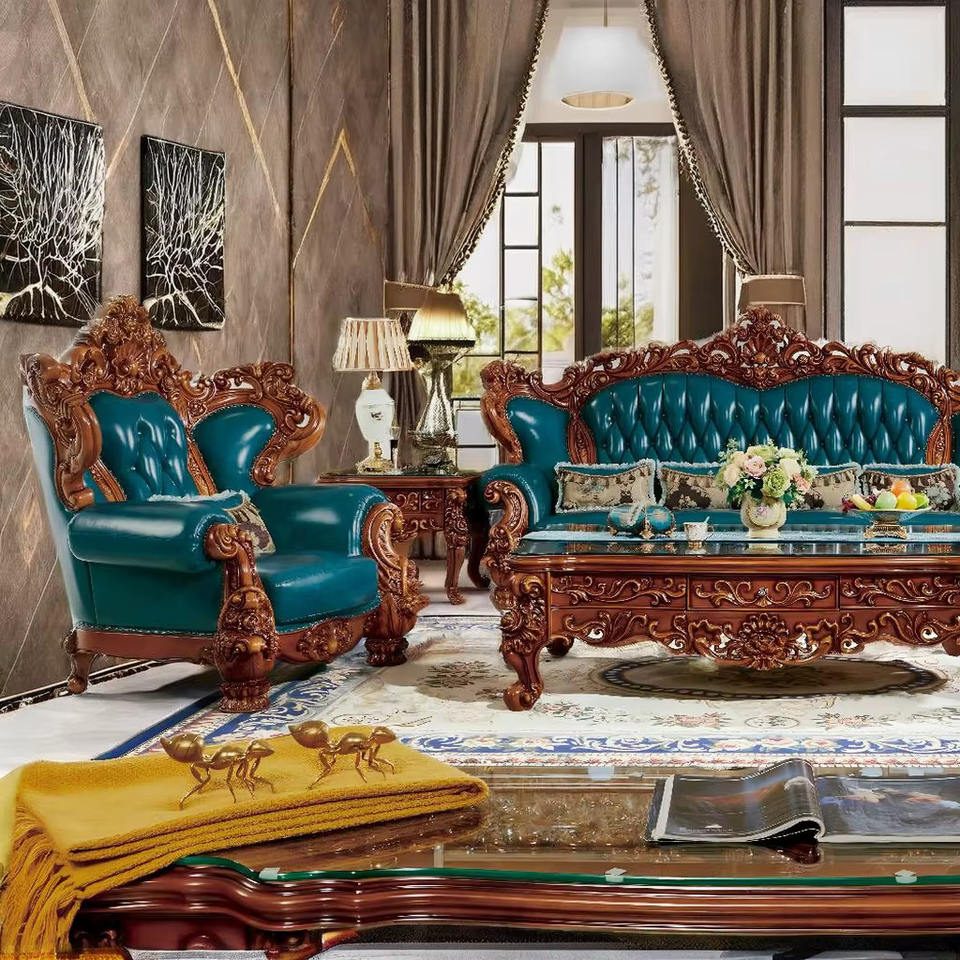 ชุดโซฟาเชสเตอร์ฟิลด์สไตล์ยุโรปสุดหรู แกะสลักด้วยไม้สักแท้ หุ้มด้วยหนังแท้ ดีไซน์โมเดิร์นยุคกลาง สำหรับวิลล่า เป็นมิตรกับสิ่งแวดล้อม