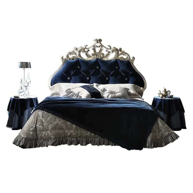 ชุดห้องนอนสไตล์ยุโรปคลาสสิกสุดหรู ประกอบด้วยเตียงคิงไซส์แกะสลักด้วยมือ ผ้ากำมะหยี่เนื้อนุ่ม โต๊ะข้างเตียงเข้าชุด และม้านั่งตกแต่ง