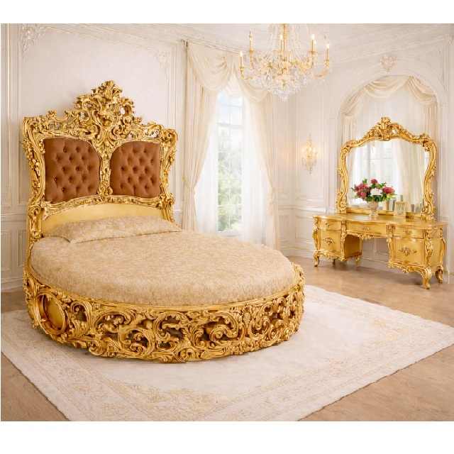 เตียงกลมสไตล์ยุโรปสุดหรูพร้อมชุดโต๊ะข้างเตียง ชุดเตียงไม้สักแกะสลักสีทองอร่าม ชุดเฟอร์นิเจอร์ห้องนอนสั่งทำพิเศษ ดัลลัส