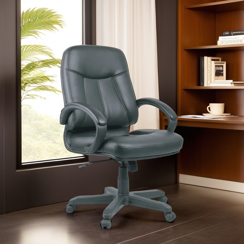 เก้าอี้สำนักงานสำหรับผู้บริหารแบบหรูหราเบาะรองแขนหมุนทำจากหนังขนาดกลางหลังเบาะรองนั่งซื้อจำนวนมากผู้จำหน่ายเฟอร์นิเจอร์