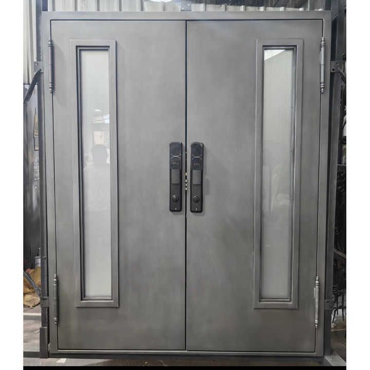 ประตูเหล็กคู่ด้านหน้าสุดหรูพร้อมดีไซน์กระจกลายเหล็กทนความร้อน