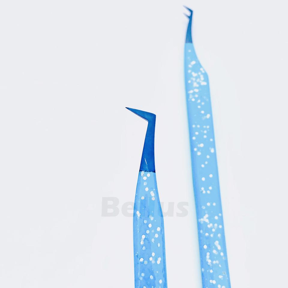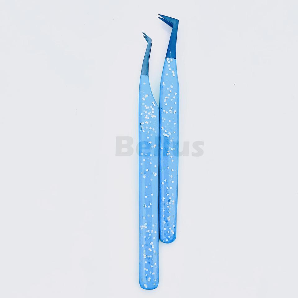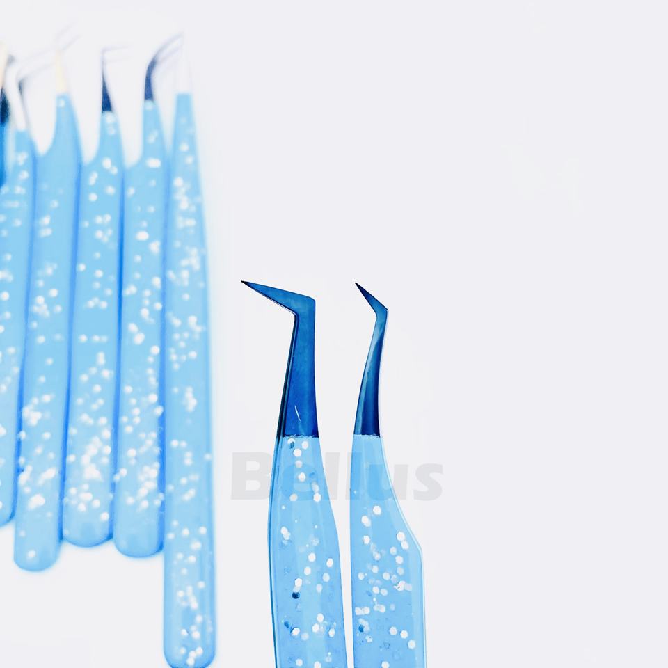 ชุดแหนบต่อขนตาสุดหรูที่มีด้ามจับแวววาวสีฟ้าและสแตนเลสปลายทองสำหรับพัดลมเพิ่มวอลลุ่มและใช้แยก