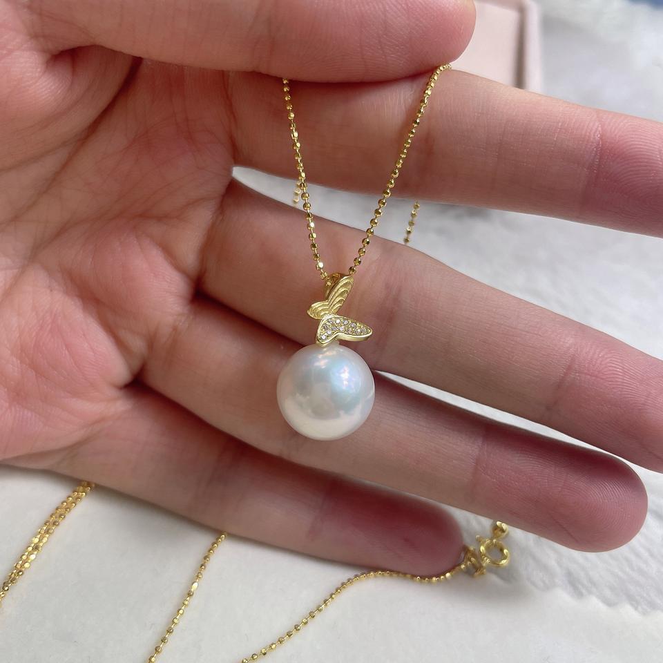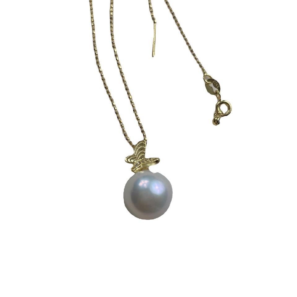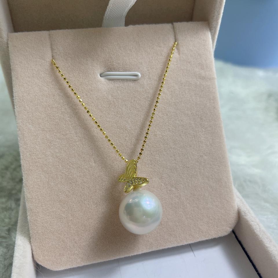 สร้อยคอมุกน้ำจืด Edison ขนาด 10-13 มม. สไตล์หรูหรา พร้อมจี้รูปผีเสื้อทรงกลม สะท้อนแสงสวยงาม บนสายสร้อยแบบ Particle
