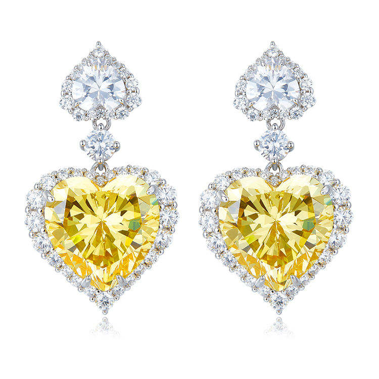 Luxury 925 Silver Drop Earrings Yellow Cubic Zirconia Heart Faux Diamond Art Deco Design Gold Plated Rhodium Rose Fashionable