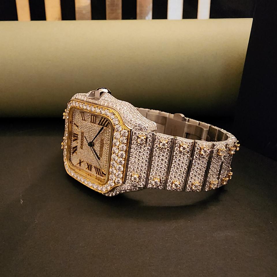 นาฬิกาสวิสหน้าปัดทรงสี่เหลี่ยมแบบแอนะล็อกสุดหรูสีเหลืองและสีขาวเพชรสีขาวเต็มรูปแบบ