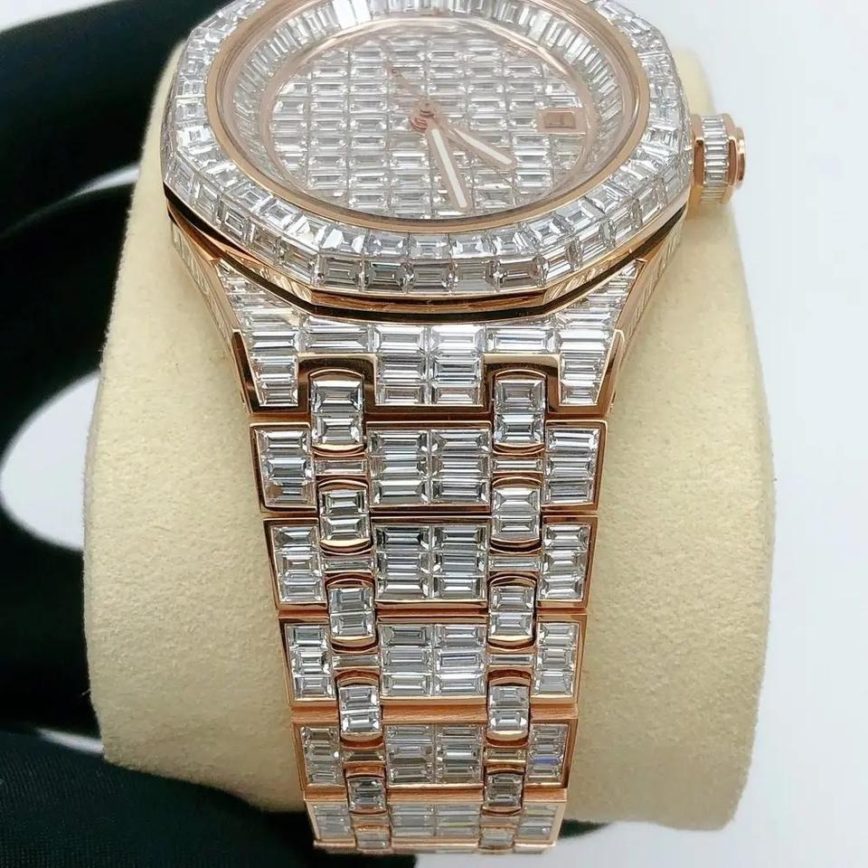 Luxury Fashion Business Moissanite Baguette Wristwatch Stainless Steel Band Analog Dial 41mm Quartz Movement Auto Date Wedding
