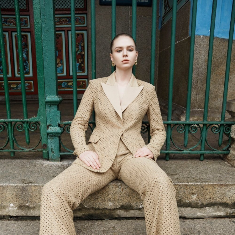 เบลเซอร์รอยบากแฟชั่นหรูหราสำหรับผู้หญิงมีปกแบบเรียบง่ายผ้าตาข่ายติดฉลากส่วนตัวเสื้อผ้าบูติกของผู้หญิง