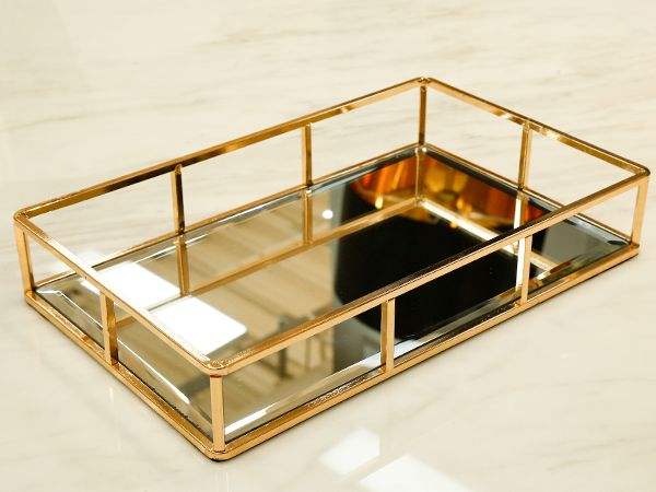 Luxury Finish Metal And Mirror Tray With Clear Base And Polished Frame Great For Makeup Storage Or Decorative Items