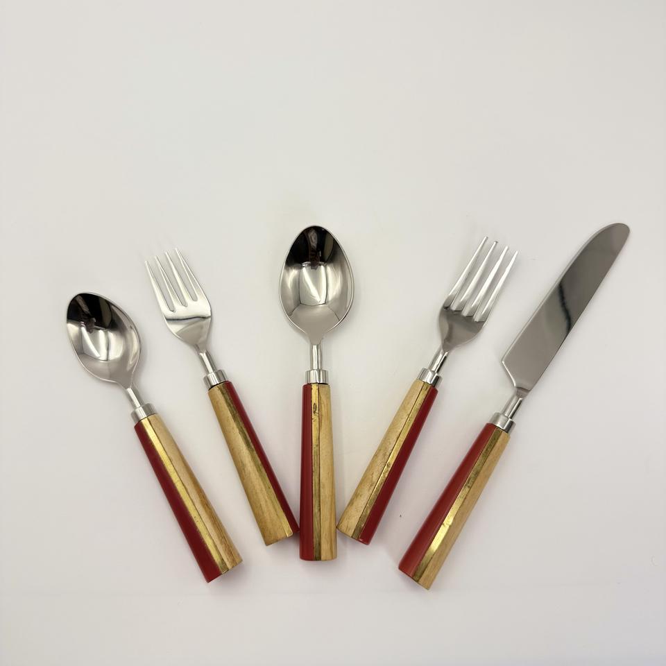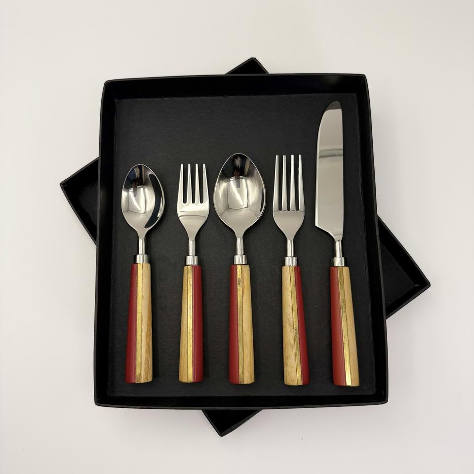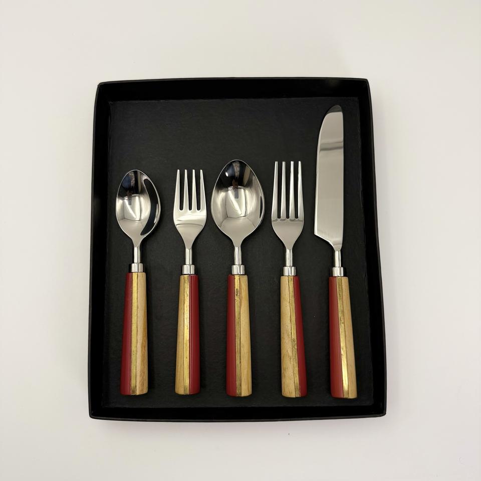 ชุดช้อนส้อมหรูห้าชิ้น ผลิตจากเหล็กขัดเงา พร้อมด้ามจับเรซิ่นใสและไม้ ดีไซน์สวยงามสำหรับงานเลี้ยง ในราคาประหยัด