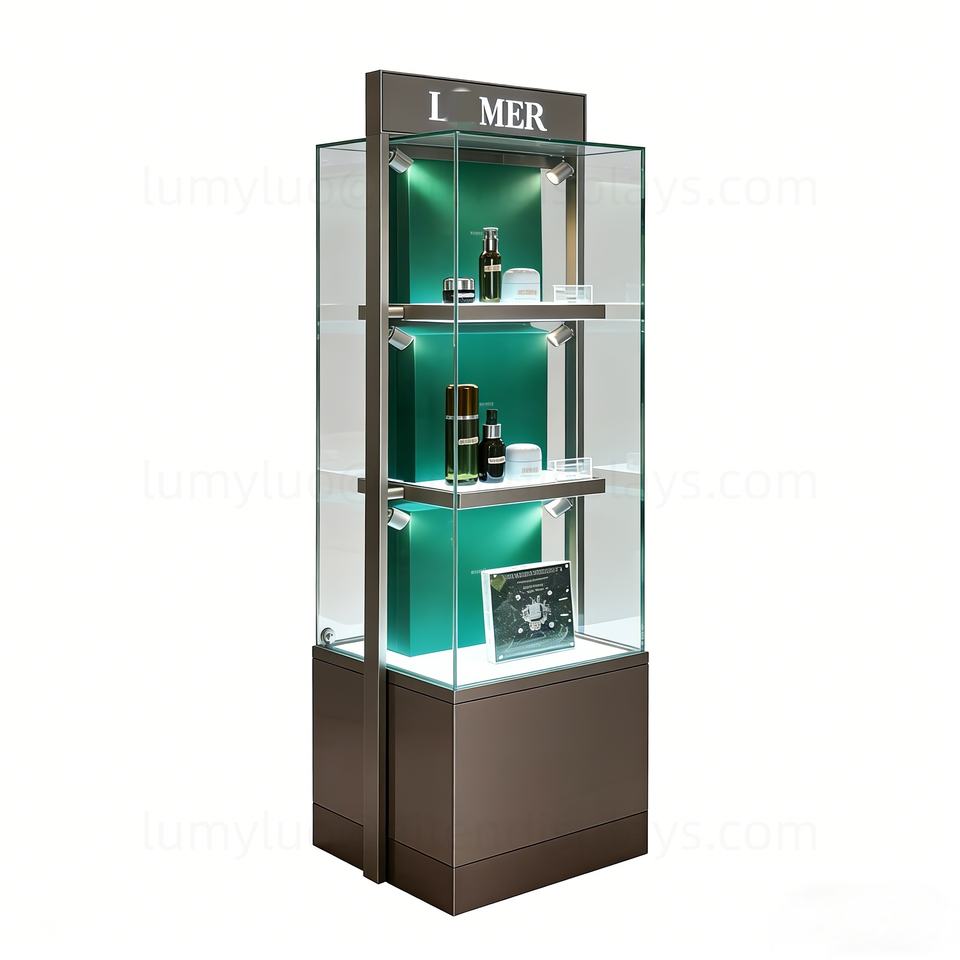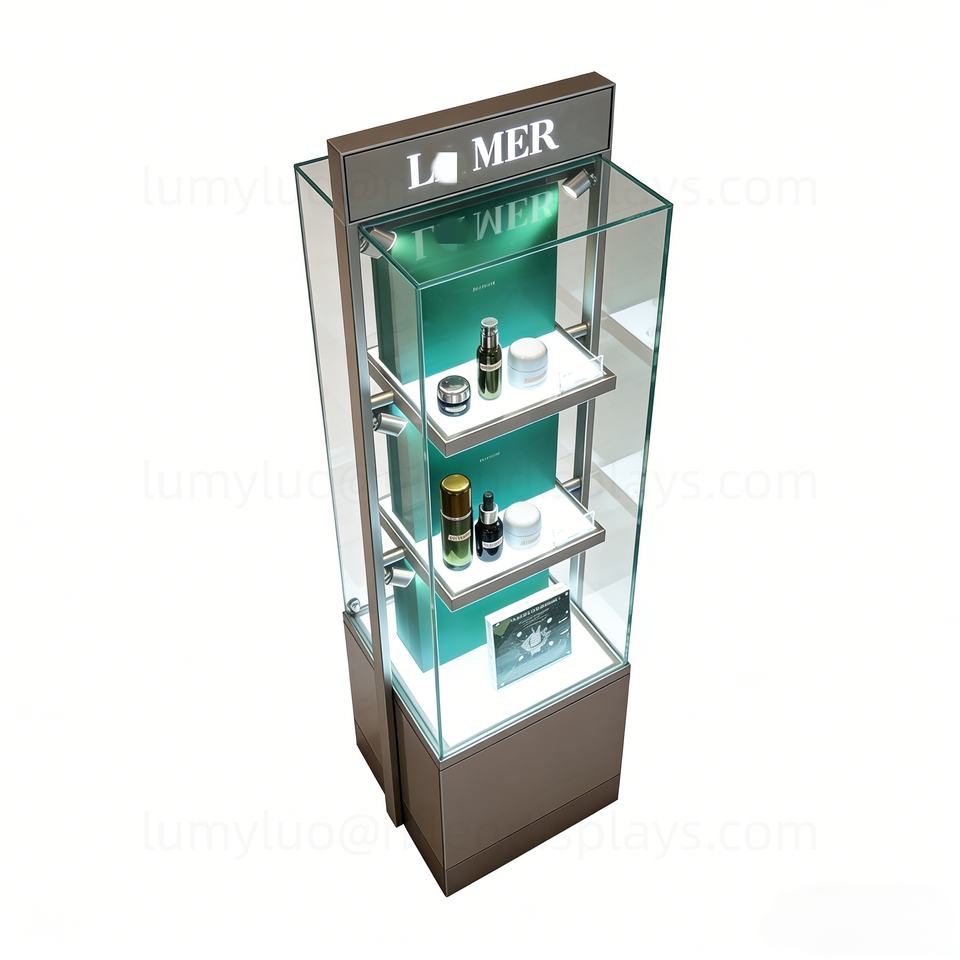 ตู้โชว์เครื่องสำอางแบบตั้งพื้นสุดหรู พร้อมกระจกนิรภัยและไฟสปอตไลท์ LED ตู้โชว์เครื่องสำอางแบบสั่งทำ