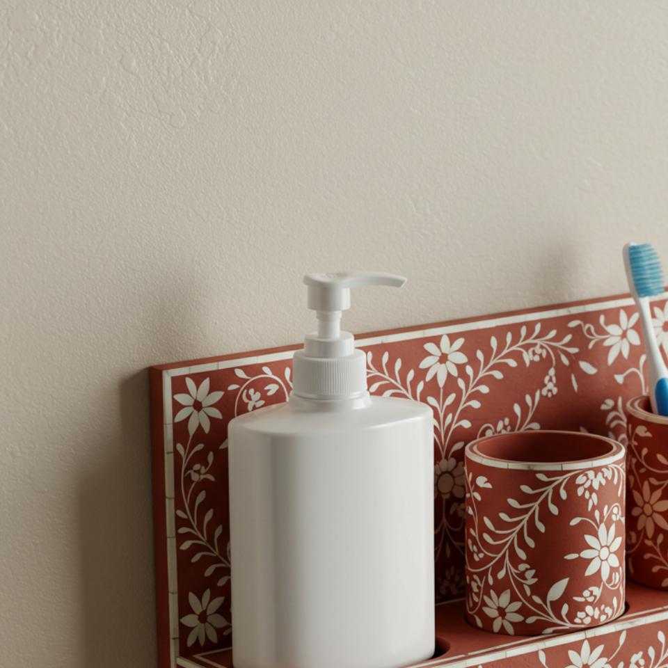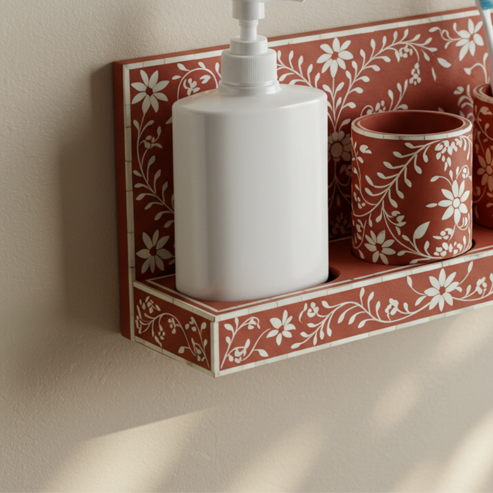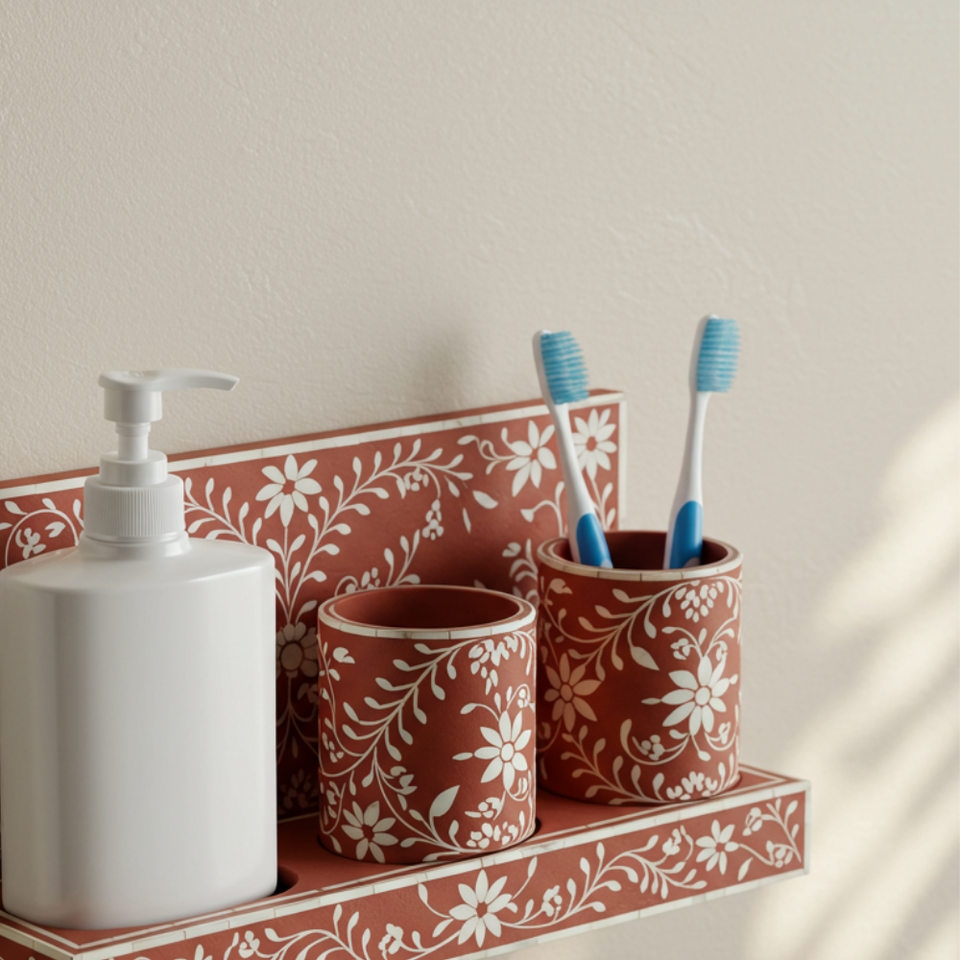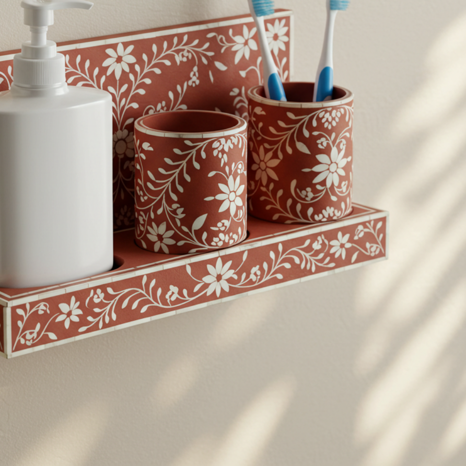 ชุดอุปกรณ์จัดระเบียบห้องน้ำลายดอกไม้หรูหรา งานฝีมือประดับลายดอกไม้ ชั้นวางของแบบลอยตัวและที่วางแปรงสีฟัน ดินเผาคุณภาพพรีเมียม