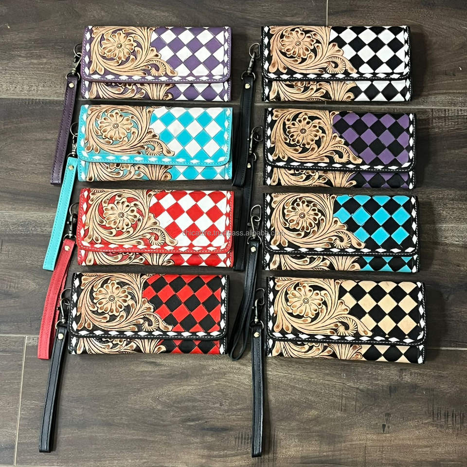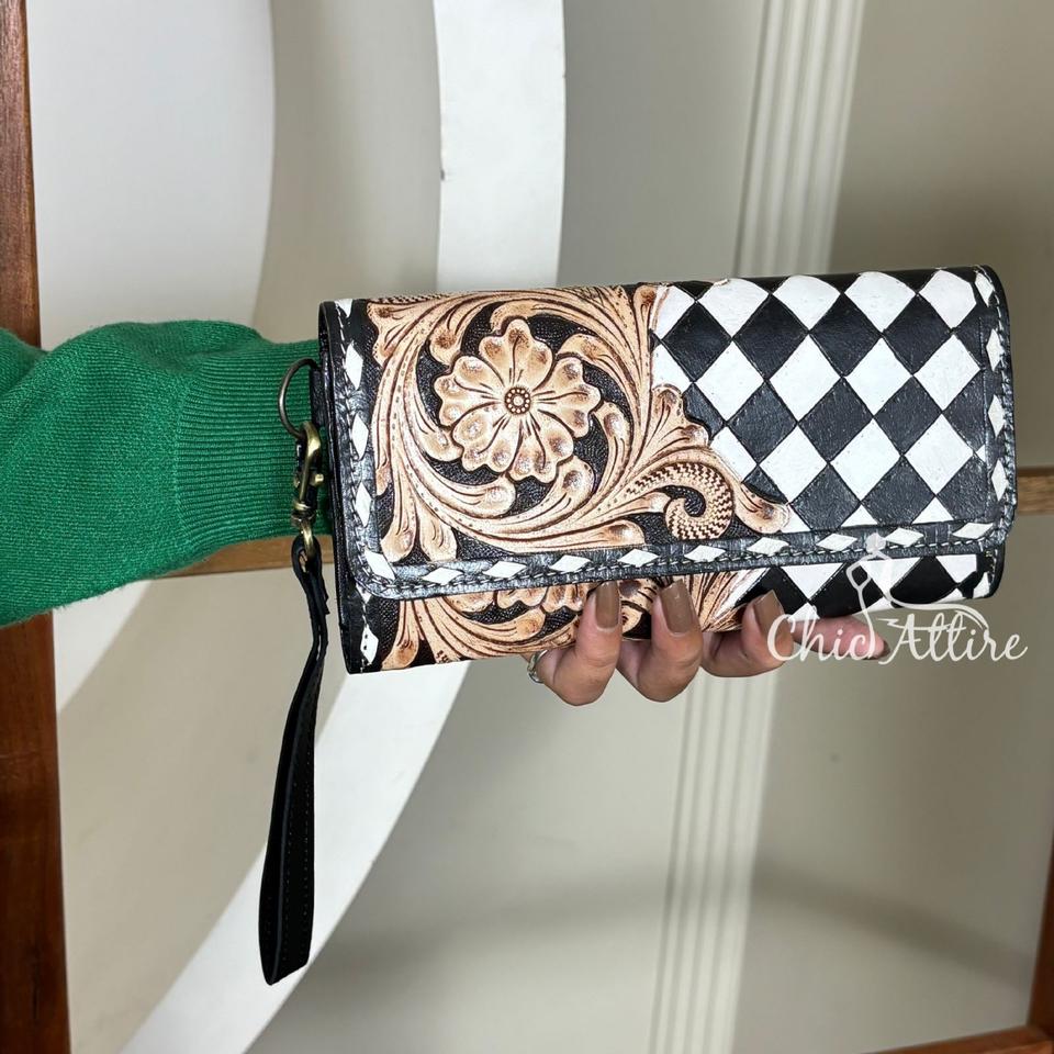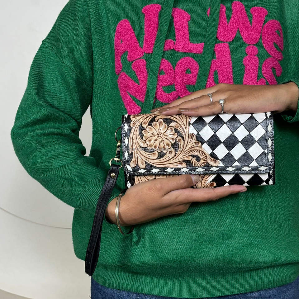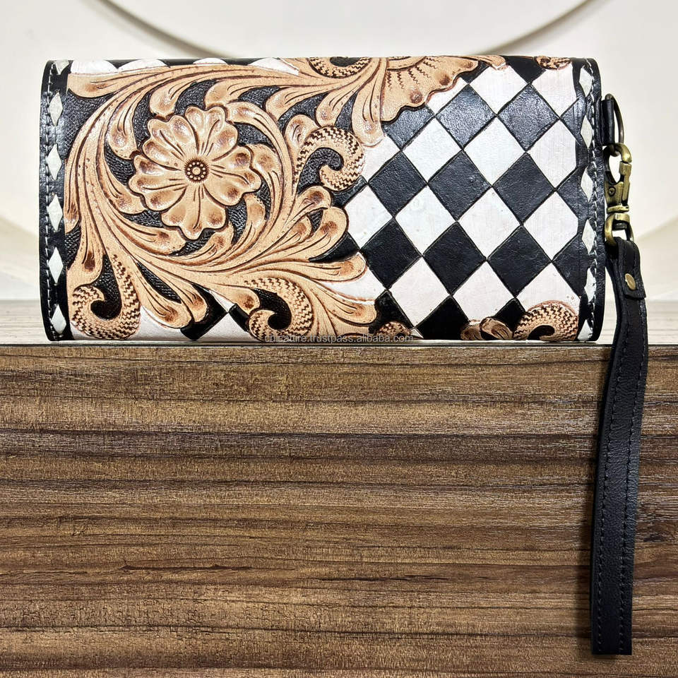 กระเป๋าสตางค์คล้องมือหนังลายตารางหมากรุกทำมือ