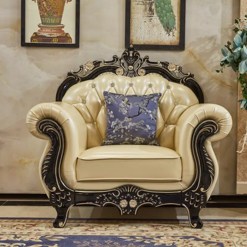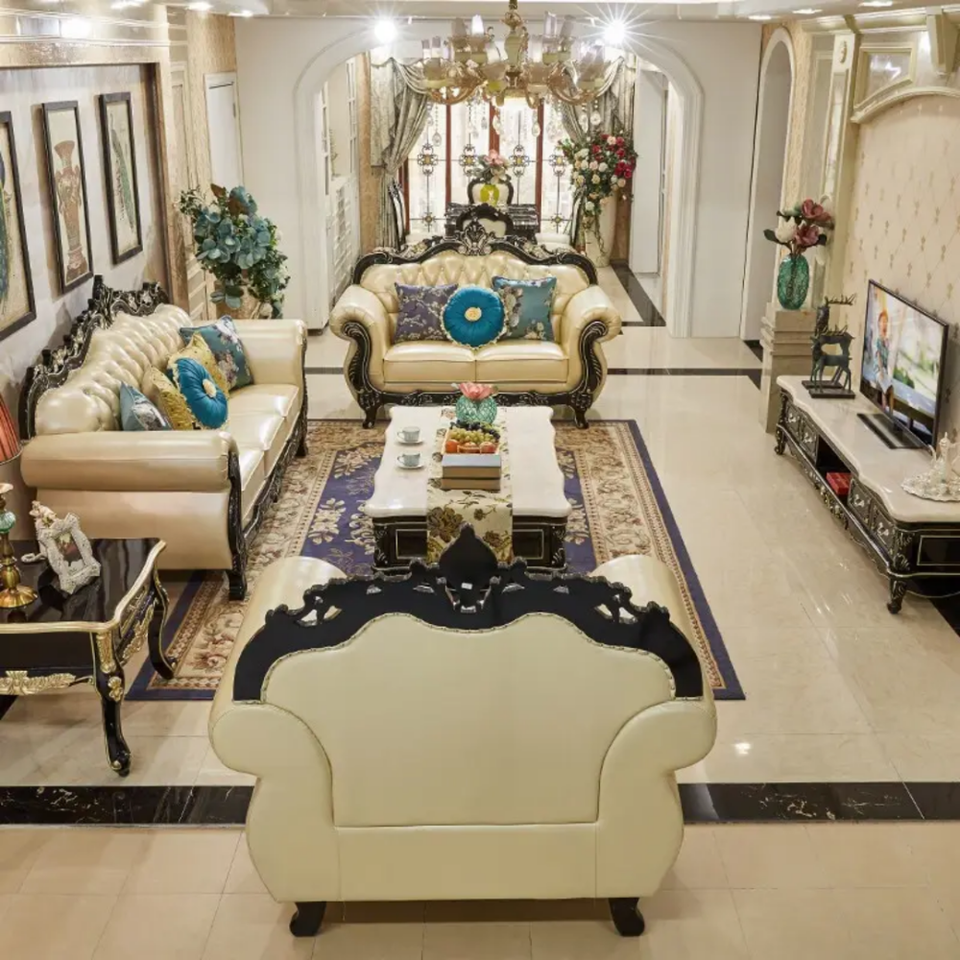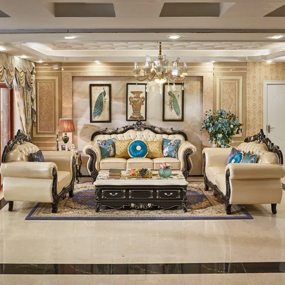 ชุดโซฟาห้องนั่งเล่นวิลล่าไม้มะฮอกกานีแท้สไตล์ฝรั่งเศสสุดหรู แกะสลักด้วยมือ หุ้มเบาะอย่างดี ผลิตในอินโดนีเซีย