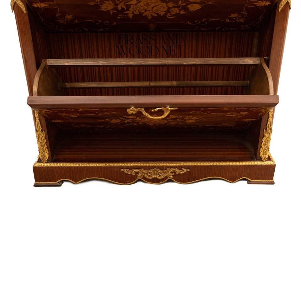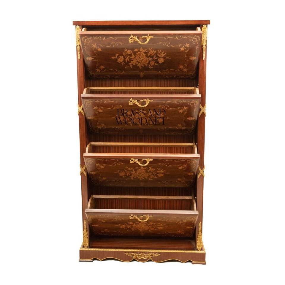 ตู้เก็บรองเท้าสไตล์ฝรั่งเศสสุดหรู 4 ชั้น พร้อมลายดอกไม้ประณีต ตกแต่งด้วยไม้มะฮอกกานีพรีเมียมและทองเหลือง