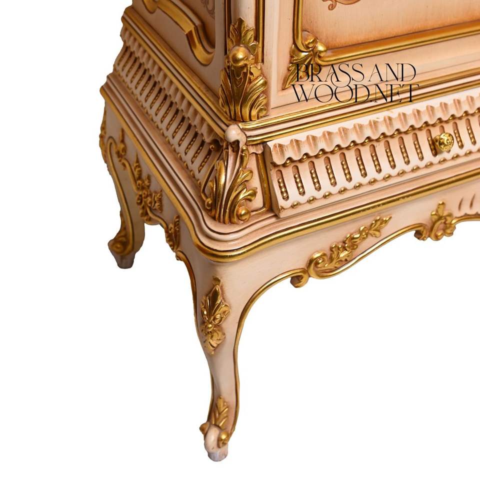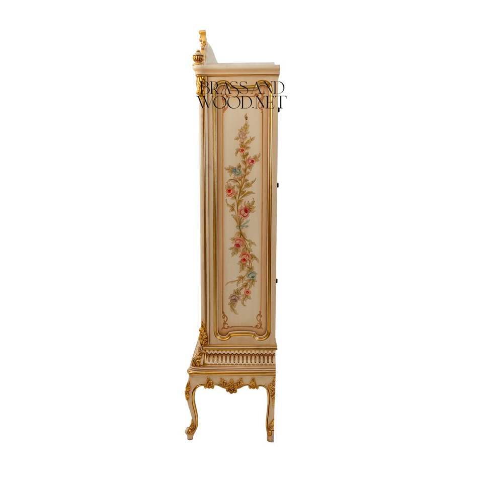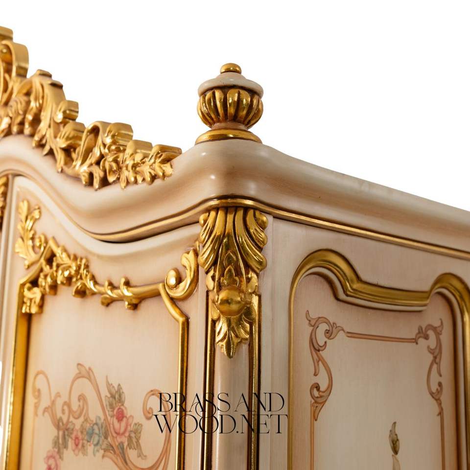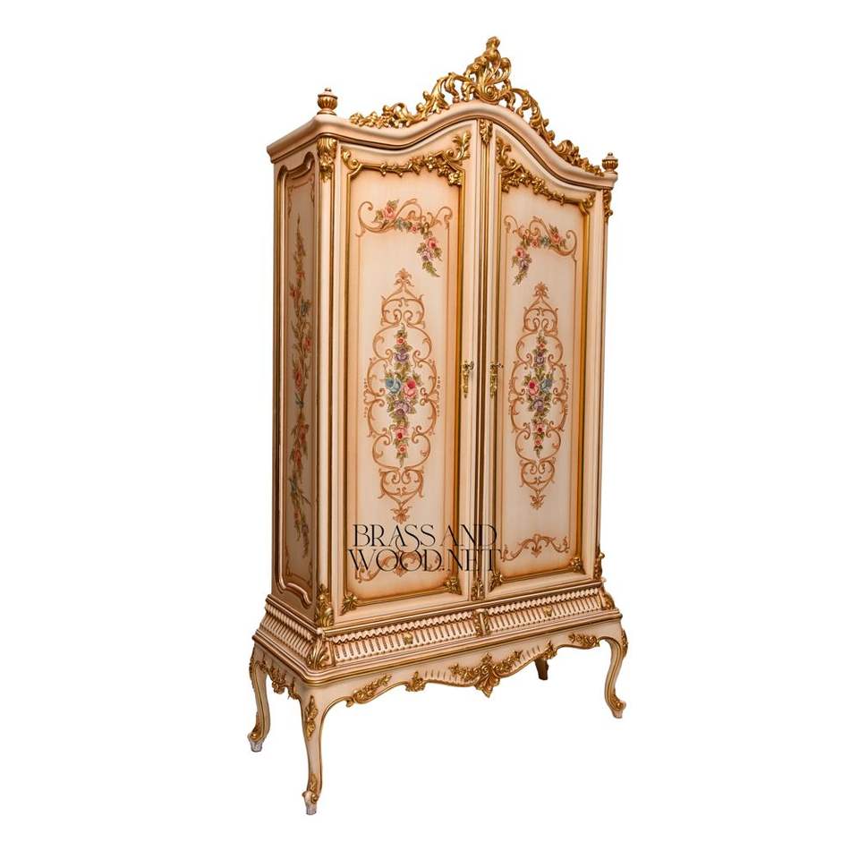 ตู้เสื้อผ้าสไตล์ฝรั่งเศสหรูหราสีเบจ พร้อมงานศิลปะลายดอกไม้เพ้นท์มือ ประดับด้วยทองคำเปลว และลวดลายแกะสลัก เหมาะสำหรับห้องแบบพระราชวัง