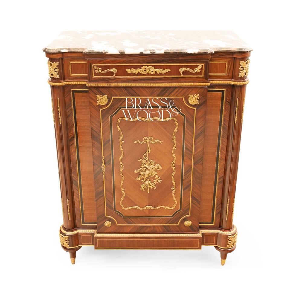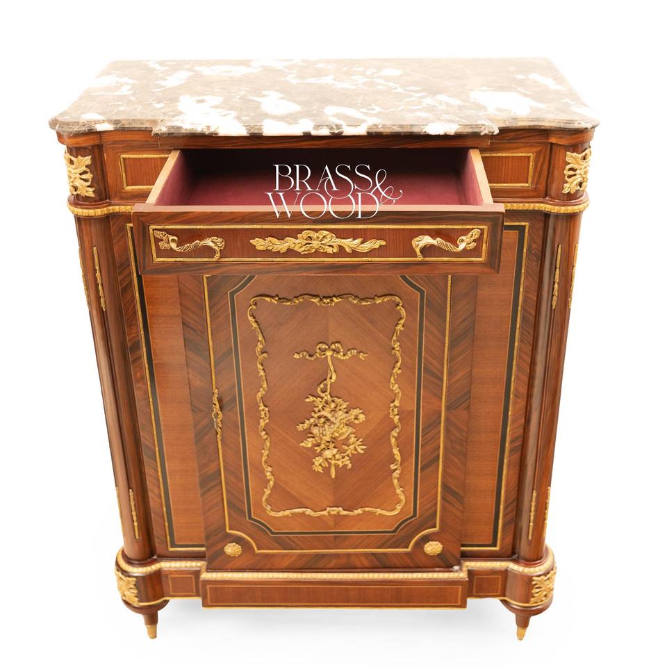 ตู้เก็บรองเท้าสไตล์ฝรั่งเศสหรูหรา พร้อมท็อปหินอ่อนพรีเมียม ลายดอกไม้ประณีต และตกแต่งด้วยทองเหลือง สำหรับห้องโถงพระราชวัง