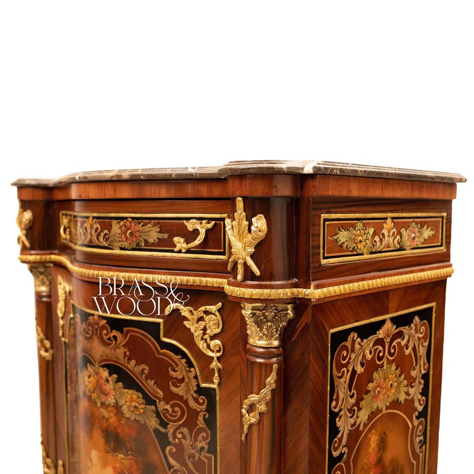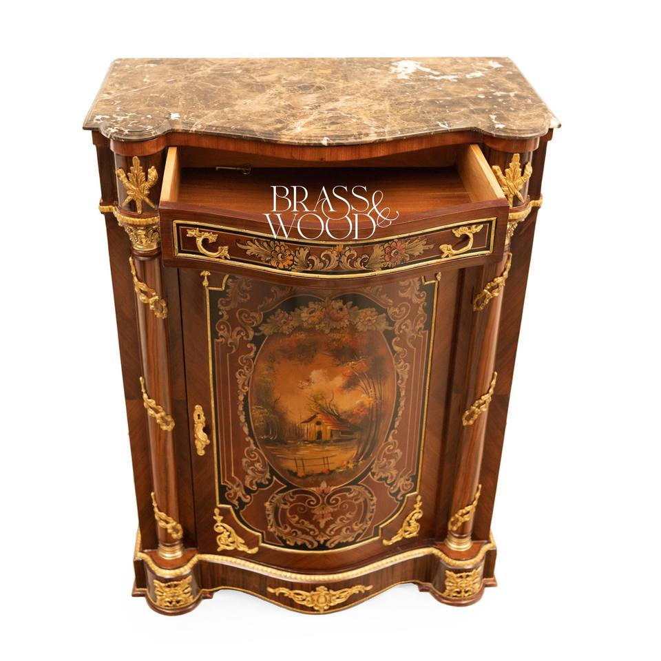 ตู้เก็บรองเท้าสไตล์ฝรั่งเศสหรูหรา พร้อมท็อปหินอ่อนสีเข้ม ตกแต่งด้วยงานศิลปะภาพวาดลายดอกไม้แบบฝังมุก ประดับด้วยทองคำ เหมาะสำหรับพระราชวัง