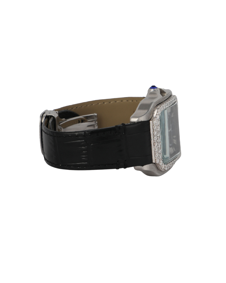 นาฬิกาข้อมือผู้ชายสุดหรู สายหนังสีดำ หน้าปัดสีดำ ประดับเพชรโมอิสซาไนต์ทรงกลมแบบเต็มหน้าปัด ตัวเรือนทองคำขาว พร้อมฟังก์ชั่นวันที่ สามารถปรับแต่งได้ตามต้องการ