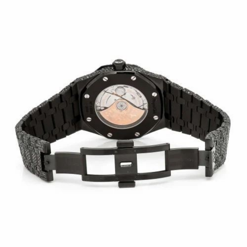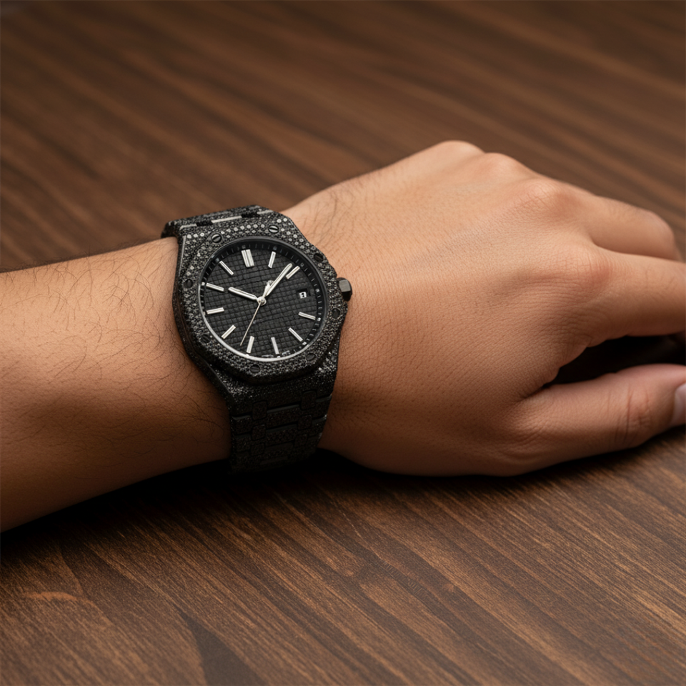 นาฬิกาหรูหราประดับเพชรโมอิสซาไนต์สีดำเต็มหน้าปัด สแตนเลสสตีล สไตล์เพชร กันน้ำ นาฬิกาข้อมือฮิปฮอป พร้อมจำหน่าย