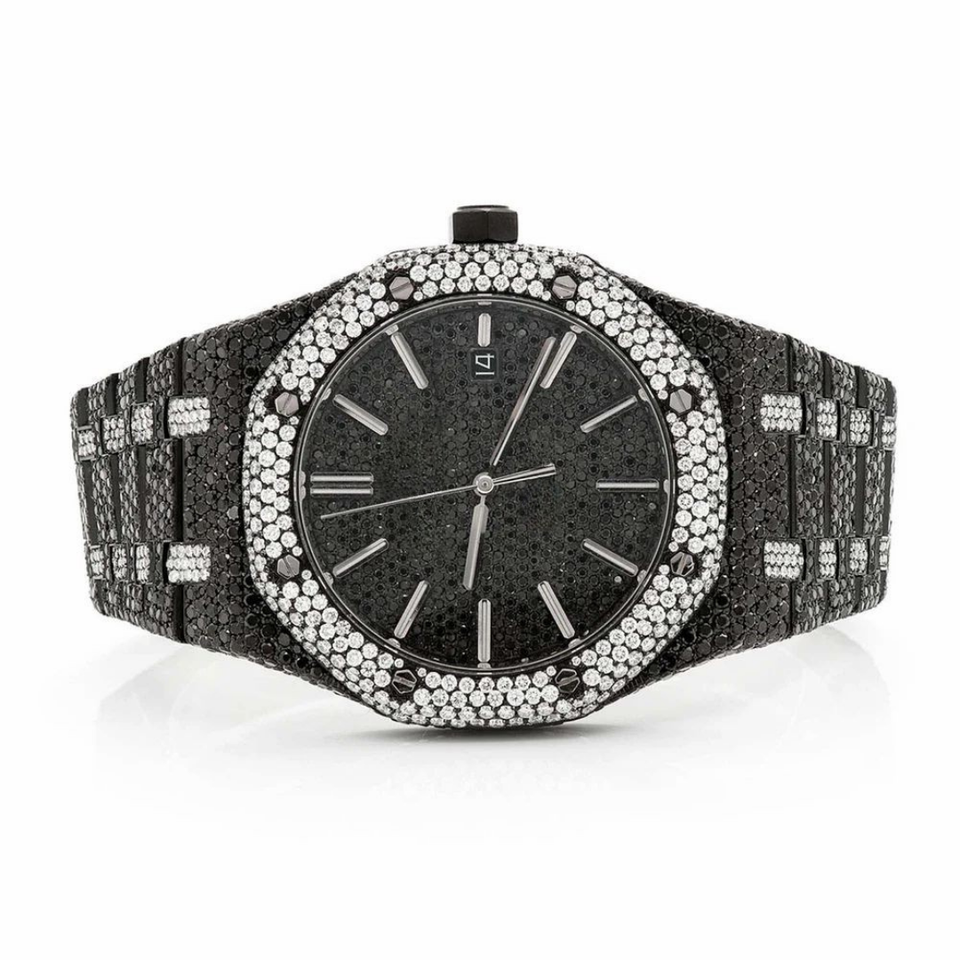 นาฬิกาหรูหราประดับเพชรโมอิสซาไนต์สีดำเต็มหน้าปัด สแตนเลสสตีล สไตล์เพชร กันน้ำ นาฬิกาข้อมือฮิปฮอป ผู้ผลิตและจำหน่าย